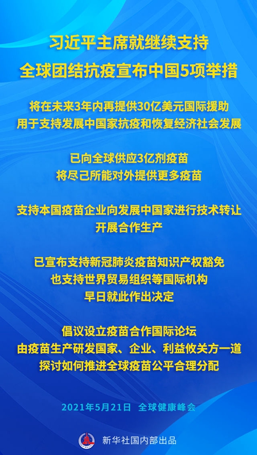其中,新冠肺炎疫苗知识产权豁免问题,是近期各方关注的一大焦点。在一些发展中国家基于自身需要提出相关诉求后,国际上也产生了一些争论,主要是如何才能既满足发展中国家抗疫迫切需求、又有效保护和激励企业研发创新积极性。 对此,中国既立场坚定,又考虑周全。 首先,支持新冠肺炎疫苗知识产权豁免,也支持世界贸易组织等国际机构早日就此作出决定,体现了“只要是有利于发展中国家抗疫努力的事情,中方都会去做;只要是有利于发展中国家公平获取疫苗的行动,中方都会支持”的一贯立场; 其次,针对有关疑虑,中方也提出了解决方案——倡议设立疫苗合作国际论坛,由疫苗生产研发国家、企业、利益攸关方一道探讨如何推进全球疫苗公平合理分配。 外交是内政的延伸。从习近平主席的倡议与举措中,我们读出了中国理念、中国智慧、中国方案——人民至上、关怀弱者、统筹各方利益、充分协商、兼顾当前和长远。 3. 为全人类担当 向80多个有急需的发展中国家提供疫苗援助,向43个国家出口疫苗……中国已向全球供应3亿剂疫苗,并将尽己所能对外提供更多疫苗。 “这场疫情再次昭示我们,人类荣辱与共、命运相连。”在共同挑战面前,没有人能独善其身。 2020年5月,疫情全球迅速蔓延的焦灼时刻,为了全人类的利益,习近平主席在第七十三届世界卫生大会上就团结抗疫提出6点建议、宣布5项举措。一年来,中国以行践言,开展了大规模的全球人道主义行动。 2021年5月,面对全球疫情的起伏反复,着眼全人类共同需求,习近平主席在全球健康峰会上又提出5点意见、宣布5项新举措。 时隔一年,两次讲话,一系列行动,贯穿着一个共同主题:共建人类卫生健康共同体。 “人类卫生健康共同体”背后,是“人类命运共同体”。百年变局与世纪疫情交织,人类命运又走到了一个新的十字路口。何去何从,考验着人们的选择。 为人民担当、为发展中国家担当、为全人类担当。世界当从中国理念、中国行动中获得启示。 主笔:杨依军、温馨 监制:赵承 策划:霍小光 统筹:刘华、王绚、雷敏 视觉 | 编辑:吴晶晶、杨文荣、唐兴、张惠慧 新华社国内部制作 新华社第一工作室出品 |