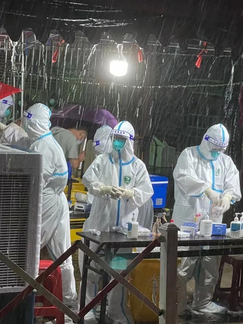 泉州市中医院采集队冒雨工作 昨晚,泉港南埔镇柳厝村下起了暴雨,泉州市中医院核酸采集队冒着大雨为村民们连夜采集核酸。 由于雨太大,没有伞,采集人员随便拿来一个袋子往身上一套,核酸一直采集到凌晨1点多,他们的衣服鞋子都湿了,因为太累了,这位医护队员就这样歪倒在椅子睡着了。