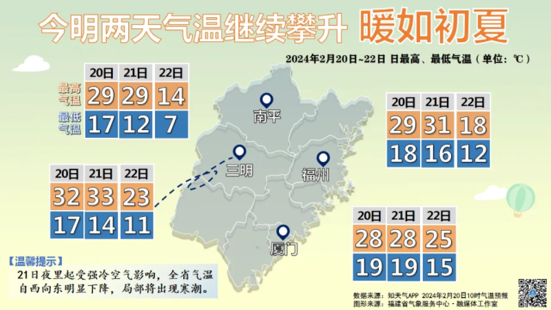 今明两天气温继续攀升,暖如初夏。来源:福建省气象服务中心 |