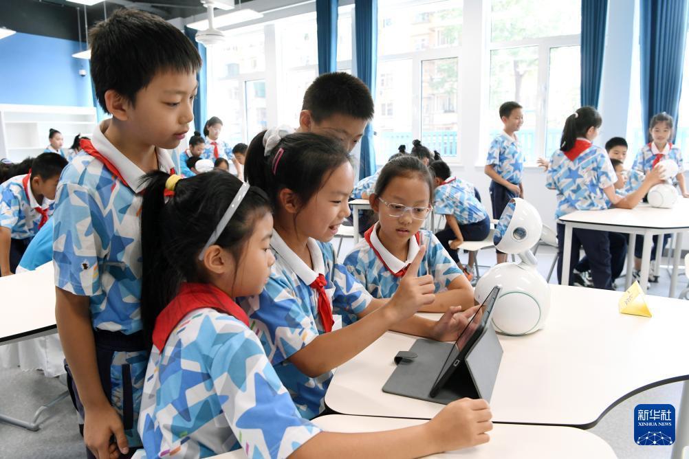 9月24日,老师为北京市第二十中学附属育鹰小学学生教授人工智能教育通识课《瓷韵中的算法密码》。 9月24日,“AI赋能强动力 国防教育育新人——数智时代国防教育创新实践交流研讨活动”在北京市第二十中学附属育鹰小学举行,本次活动旨在落实“人工智能+教育”与2025年“全民国防教育月”活动要求,通过人工智能和国防教育现场课等形式,展示人工智能技术在教育尤其是国防教育中的创新和应用。 新华社记者 马宁 摄