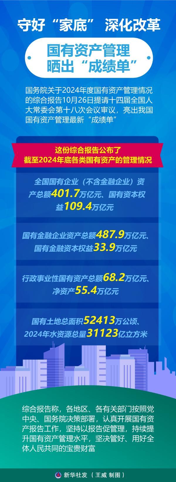 新华社北京10月26日电 题:守好“家底” 深化改革——国有资产管理晒出“成绩单” 新华社记者申铖 国务院关于2024年度国有资产管理情况的综合报告26日提请十四届全国人大常委会第十八次会议审议,亮出我国国有资产管理最新“成绩单”。 这份综合报告公布了截至2024年底各类国有资产的管理情况: ——全国国有企业(不含金融企业)资产总额401.7万亿元、国有资本权益109.4万亿元; ——国有金融企业资产总额487.9万亿元、国有金融资本权益33.9万亿元; ——行政事业性国有资产总额68.2万亿元、净资产55.4万亿元; ——国有土地总面积52413万公顷、2024年水资源总量31123亿立方米。 综合报告称,各地区、各有关部门按照党中央、国务院决策部署,认真开展国有资产报告工作,坚持以报告促管理,持续提升国有资产管理水平,坚决管好、用好全体人民共同的宝贵财富。 国务院关于2024年度企业国有资产(不含金融企业)管理情况的专项报告当日也提请十四届全国人大常委会第十八次会议审议。这份专项报告透露,5年来,全国国有企业资产总额、负债总额、国有资本权益总额年均分别增长11.4%、11.7%、11.0%,资产负债率保持在65%以内。 除了公布国有资产“家底”情况,报告也呈现了资产管理和改革的新动向。 健全国资国企管理监督体制机制,完善中国特色现代企业制度;强化国有金融资本产权管理,支持提升金融服务实体经济质效;持续夯实行政事业性国有资产管理制度基础,深化资产预算管理协同;夯实自然资源资产保护利用的空间基础,守牢自然资源资产安全底线……综合报告里的一项项进展,体现了国有资产管理取得积极成效。 综合报告透露,下一步,将进一步深化国资国企改革,高质量完成国有企业改革深化提升行动,健全国资监管法规制度,优化国有经济布局结构,以新型举国体制推进科技创新,严防重点领域风险。 此外,下一步,还将完善国有金融资本管理体制,提升行政事业性国有资产管理水平,健全自然资源资产管理制度体系,全面提升国有资产报告质效。 国有资产是全体人民的共同财富,必须管好用好。综合报告称,坚持以国有资产报告工作为抓手,全面摸清国有资产家底、盘活存量资源资产、提升管理效能,推动国有资产治理开创新局面、迈上新台阶。