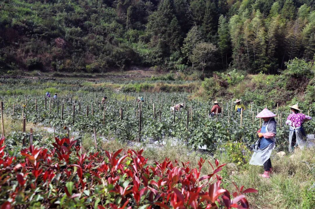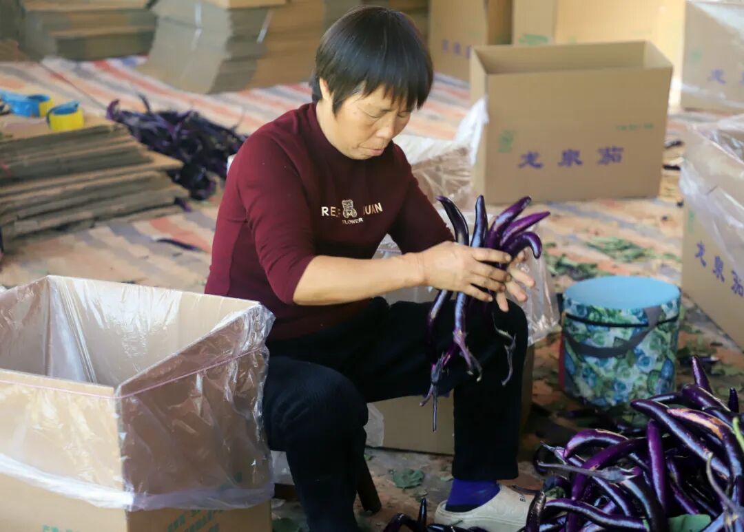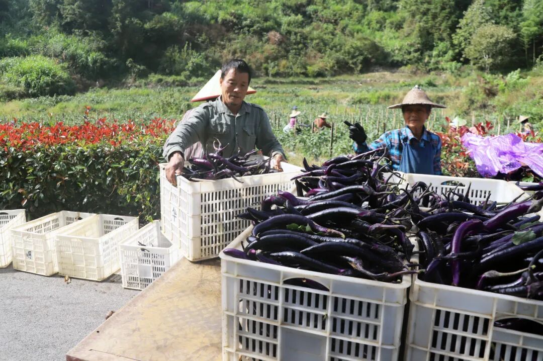 眼下,管厝乡党溪村的70余亩茄子喜迎丰收。10月29日,连片的田地里,村民们正忙着采收,紫亮的茄子于翠绿的叶片间若隐若现。不远处的棚子下,几位村民正熟练地将刚摘的茄子分拣、装箱,准备发往浙江龙泉等地。这片6月初开始采摘的茄子地,将持续至11月中旬,预计总产量60余万斤。