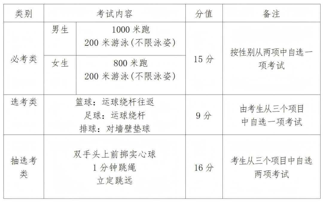近日 漳州、宁德、泉州 确定2026年体育中考项目 具体内容一起来看 ↓↓↓ 漳州市 11月4日,2026年漳州市初中毕业升学体育考试,抽选考类测试项目抽签结果公布: 抽选考类六选三是:50米跑、1分钟跳绳、1分钟仰卧起坐。考生可从三个项目中自选2项考试。 现行的篮球、足球、排球“三大球”抽考项目改为选考,考生可从三个项目中自选1项考试。 在考试内容方面,体育与健康基本知识考试将调整为日常检测,原中考分值调整至运动技能测试。 中考体育分值结构上,保持总分值40分不变,具体分配为:必考类15分(1000米/800米跑、200米游泳)、选考类9分(“三大球”)、抽选考类16分(50米跑、立定跳远、1分钟跳绳、引体向上/斜身引体、双手头上前掷实心球、1分钟仰卧起坐)。 宁德市 11月4日,宁德市教育局组织开展了2026年体育中考身体素质与运动能力测试抽选考项目现场抽选活动,并发布《关于宁德市2026年体育中考抽选考项目抽选结果的通知》,确定2026年宁德市体育中考抽选考项目。 此次抽选考类从六项:50米跑、立定跳远、1分钟跳绳、引体向上(男)/斜身引体(女)、双手头上前掷实心球、1分钟仰卧起坐中随机抽选三项。 经现场公开随机抽选,最终确定: 抽选考项目为:50米跑、1分钟跳绳、1分钟仰卧起坐。(考生从这三个项目中自选两项进行考试) 必考类项目为:1000米(男)/800米(女),200米游泳(不限泳姿),考生根据性别自行选择一项考试。 选考类项目为:篮球:运球绕杆往返、足球:运球绕杆、排球:对墙壁垫球,由考生从三个项目中自选一项考试。 考试分值