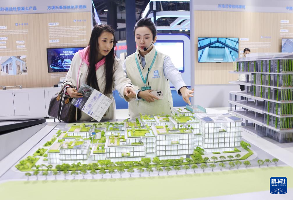 11月6日,讲解员(右)在住博会上向观众介绍展出的节能建筑。 第二十二届中国国际住宅产业暨建筑工业化产品与设备博览会11月6日在北京开幕。本届住博会汇聚了来自国内外的行业企业200余家,展览规模1.7万平方米,以“共享创新 共建未来 构建开放合作产业协作新生态”为主题,重点展示了国内外最新住房城乡建设领域技术和产品,推进科技创新成果应用,引领产业转型升级,并同期开展“好房子科技展”。 新华社记者 潘旭 摄
