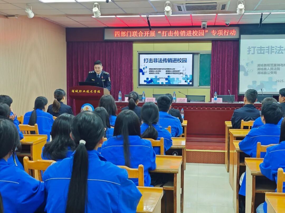 11月12日,浦城县市场监管局联合县公安局、检察院、人民法院在浦城县职业技术学校开展“打击非法传销进校园”普法宣传活动,进一步筑牢校园防范传销安全防线,守护在校学生身心健康与财产安全。