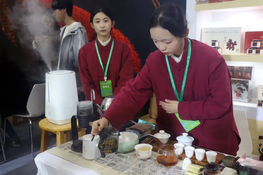 展示茶道技艺 “浦城丹桂花茶,底蕴深厚,创新十足。”孙威江在细致品鉴了多款产品后指出,浦城充分利用“中国丹桂之乡”的资源优势和独特的非遗窨制技艺,成功打造了丹桂红茶、白茶、乌龙茶等系列产品,其香气馥郁、茶汤甘醇、滋味融合度高的特点,正是“三茶”统筹理念的生动实践。 “大口窑青白瓷与丹桂花茶的同台展示,构成了‘茶器相映’的雅致格局,极大提升了产品的文化附加值。”那么,面对产业高质量发展的新要求,浦城茶产业该如何突破?孙威江建议,浦城应继续在“标准”与“科技”上双轮驱动,要建立丹桂花茶的感官品质与理化成分标准体系,用科学数据定义好茶风味;要深化窨制工艺机理研究,利用科技手段稳定并提升品质,让公共品牌走得更远、更稳。