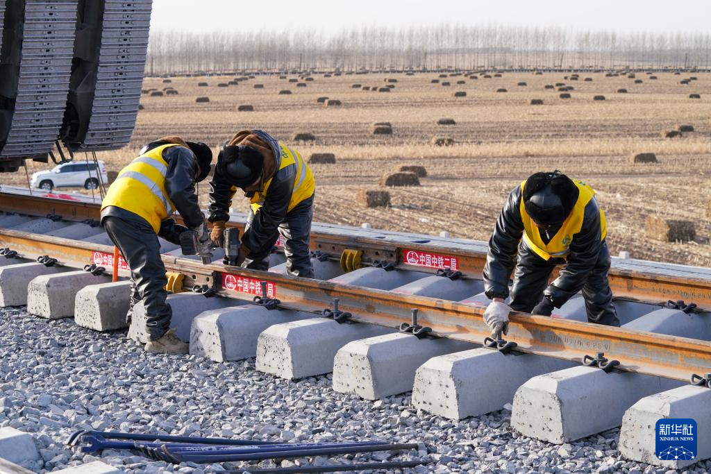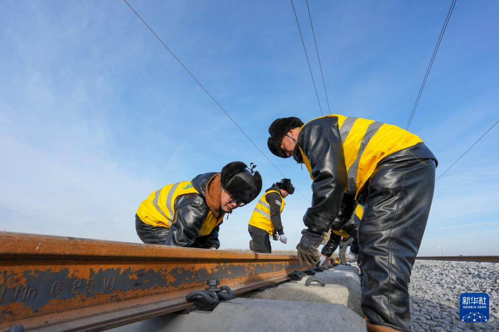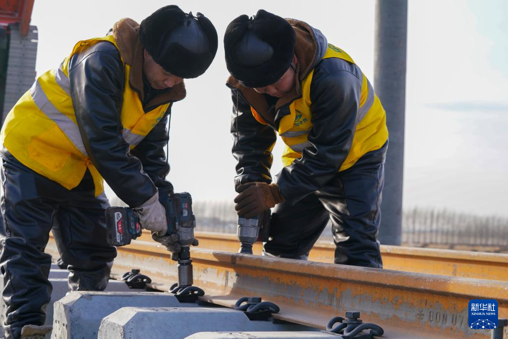 11月25日,工人在黑龙江省绥化市庆安县永华村哈伊高铁哈铁段铺轨现场工作。 11月25日,在黑龙江省绥化市庆安县永华村哈伊高铁哈铁段铺轨现场,施工方中铁二局的四名工人手持电动扳手,将最后一对钢轨螺栓拧紧,标志着我国"十四五"重点工程哈伊高铁全线铺轨贯通,为后续联调联试奠定基础。 据了解,哈伊高铁于2024年5月28日正式启动铺轨,是我国"八纵八横"高铁网京哈—京港澳通道的重要延伸,也是在建纬度最高、全年温差最大,且首条穿越多年岛状冻土区的高速铁路。 新华社记者 王松 摄