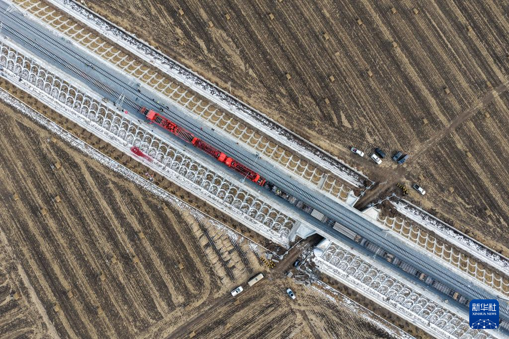 这是11月25日在黑龙江省绥化市庆安县永华村拍摄的哈伊高铁哈铁段铺轨现场(无人机照片)。 11月25日,在黑龙江省绥化市庆安县永华村哈伊高铁哈铁段铺轨现场,施工方中铁二局的四名工人手持电动扳手,将最后一对钢轨螺栓拧紧,标志着我国"十四五"重点工程哈伊高铁全线铺轨贯通,为后续联调联试奠定基础。 据了解,哈伊高铁于2024年5月28日正式启动铺轨,是我国"八纵八横"高铁网京哈—京港澳通道的重要延伸,也是在建纬度最高、全年温差最大,且首条穿越多年岛状冻土区的高速铁路。 新华社记者 王松 摄