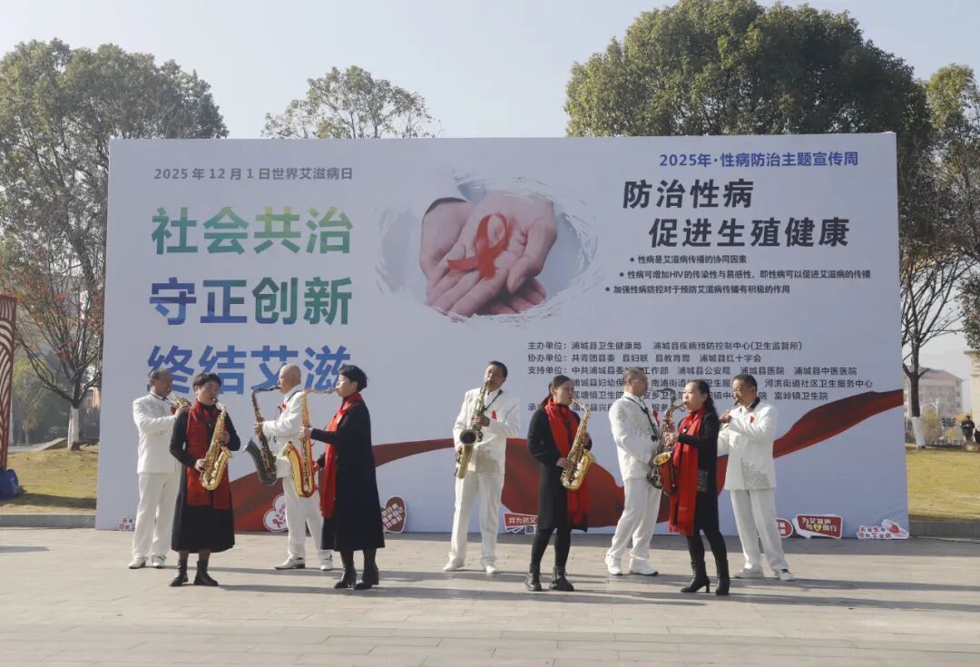 精彩表演 现场设置五大功能区,有效构建了知识普及、消除歧视与社会动员一体化的宣传新范式:舞台表演区呈现腰鼓、萨克斯、防艾主题舞蹈等精彩节目,并穿插有奖问答环节;“科学防艾”核心宣传区通过立体展板与多媒体互动,系统展示防治知识;“健康浦城”义诊咨询区集结县疾控、县医院、妇幼保健院等医疗专家,提供专业咨询与免费检测;政策宣传区由公安、教育、妇联等单位针对重点人群开展普法与健康教育;“容光焕发”公益服务区则组织志愿者为居民特别是老年人提供免费理发,在温馨服务中传递关怀。