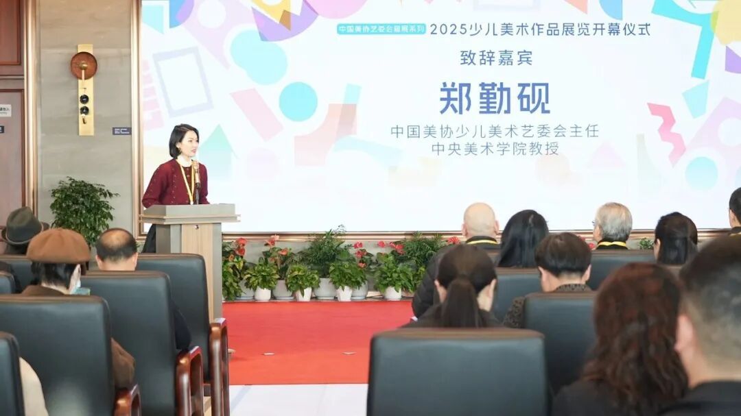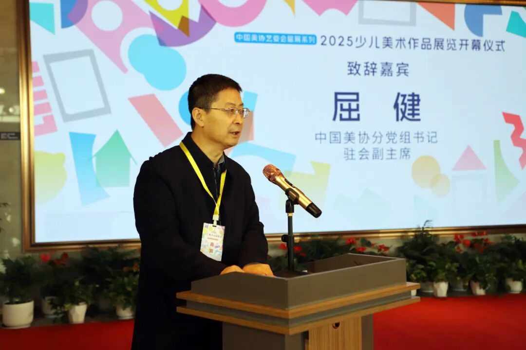 屈健在开幕式上致辞。他指出,少儿美术绝非简单的技能传授,而是“立德树人”的重要途径,是关乎心灵塑造、文化传承与创造力激发的根本事业。本次展览正是深入学习党的二十届四中全会精神,践行习近平总书记关于少儿美术与美育工作重要论述的一次生动实践。希望广大少儿美育工作者坚守“以美育人、以文化人”的初心,引导孩子们在感知美、创造美的过程中,树立高远的审美追求,涵养深沉的家国情怀,将中华美育精神代代相传,共同谱写新时代中国少儿美术绚丽多彩的篇章。