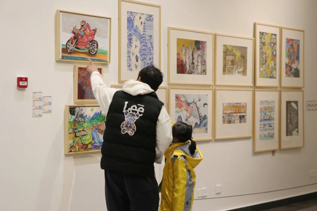 中国美协分党组书记、驻会副主席屈健,福建省文联党组成员、副主席、省美协主席王来文参观浦城美术馆/范迪安美术馆 本次作品题材丰富、形式多样,涵盖国画、油画、水彩画、版画、漆画、综合材料、线描剪纸等多种艺术形式,独特的创意、大胆的色彩搭配和充满童趣的表达,吸引了大批游客前来浦城美术馆/范迪安美术馆参观,成为冬日里一道别样的艺术风景线。 走进展厅,一幅幅充满想象力的作品整齐陈列,瞬间将游客带入孩子们纯真烂漫的艺术世界。有的作品以家乡的山水风光为原型,用细腻的笔触勾勒出田园美景;有的作品聚焦科幻主题,展现出少儿天马行空的创造力;还有的作品描绘了家庭生活的温馨瞬间,传递出满满的爱与温暖,无不体现出孩子们丰富的想象力和灵巧的双手。