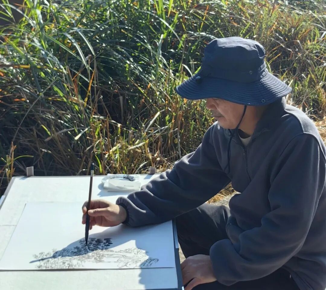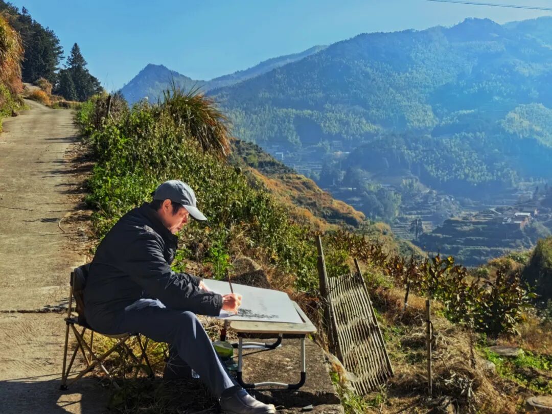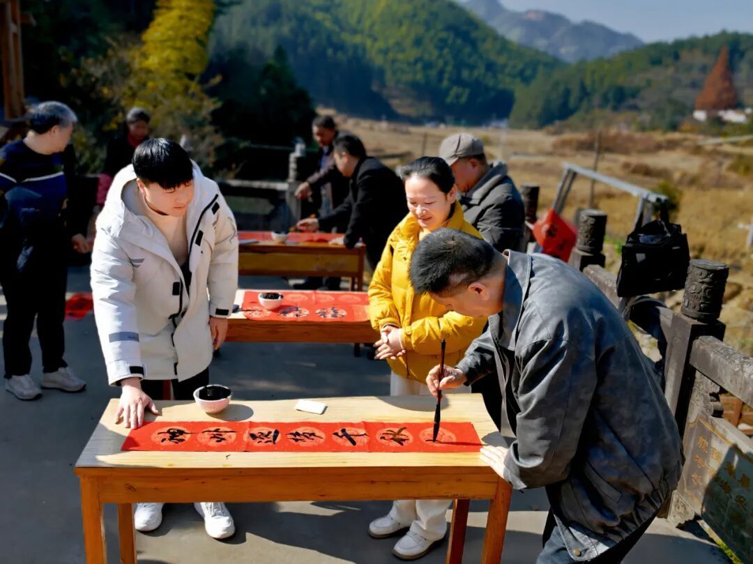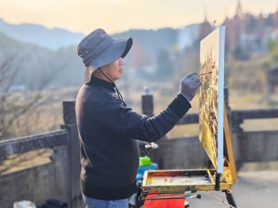 红纸迎春,笔走福至 丹青行野,纸上田园 午后阳光正好,画家们背起画板、拎起小马扎,沿着枫岭古驿道分组“打卡”。有的蹲在田埂,以稻茬作前景,远处黛瓦粉墙入画;有的钻进百年古树群,让金黄落叶在宣纸上“二次绽放”;还有的直接把画架支在溪涧边,听水声调色,任山风“修改”线条。三个小时后,十几幅“枫溪冬野”速写整齐亮相氧8大厅:山岚、炊烟、古树、石拱桥……每一幅都在“喊”同一句话——“把乡村带回家”。