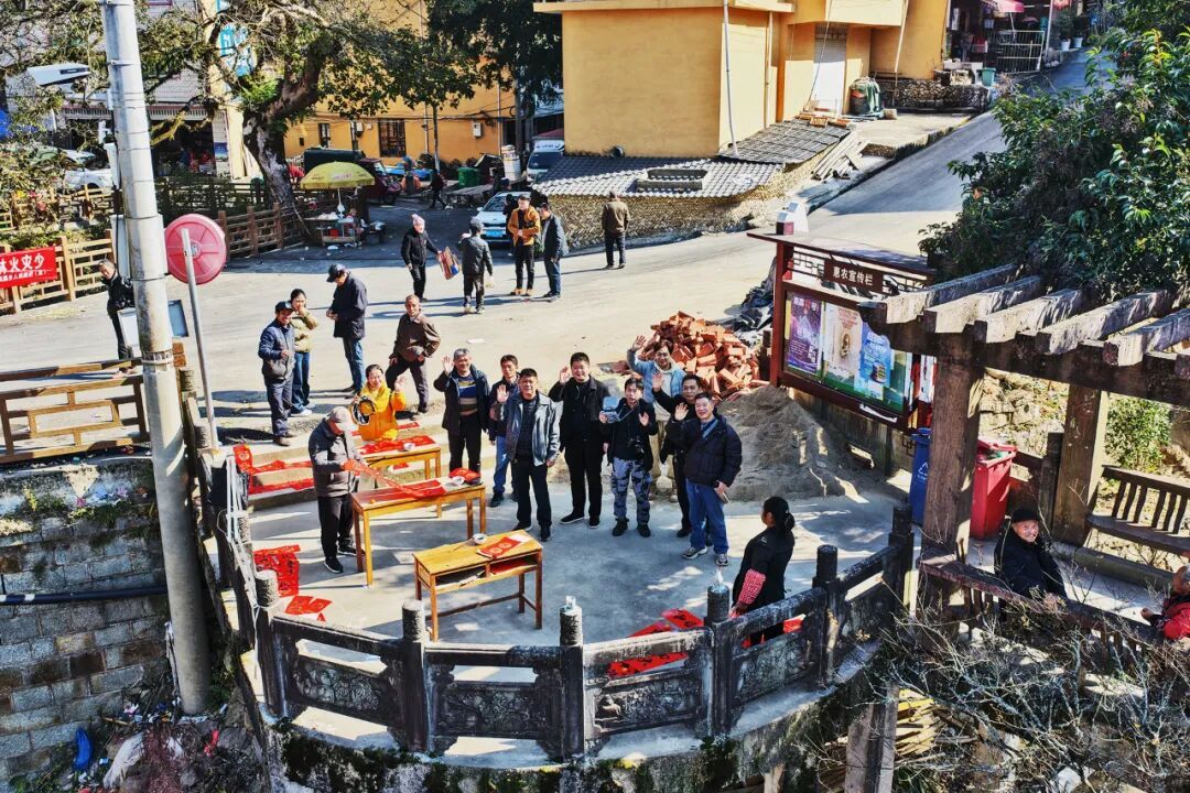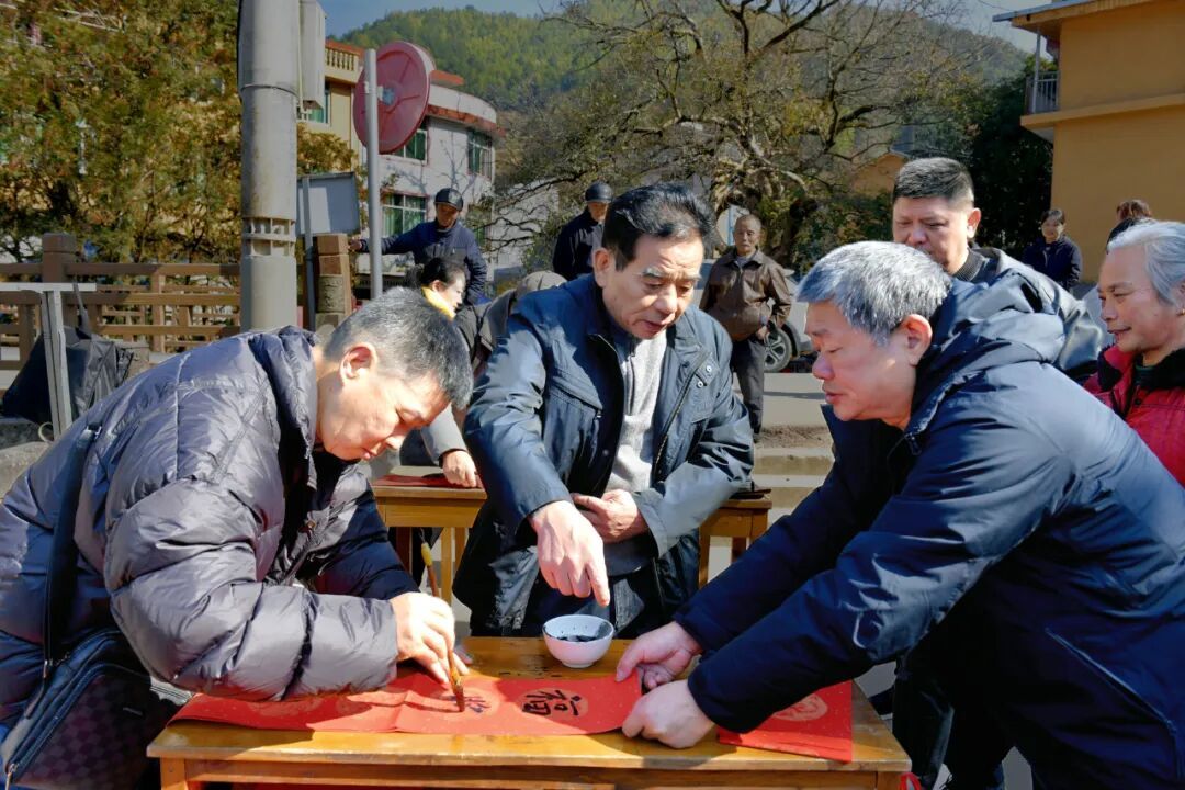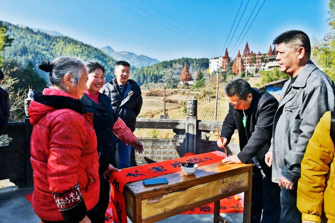 氧8茗宿风光 红纸迎春,笔走福至 清晨,霜花未化,枫溪街廊桥上,长桌一字排开,红纸翻飞,墨香蒸腾。书法家们站笔悬腕,一副副春联一气呵成——“枫染千山醉,溪涵万象新”“山抱古村春早到,门迎福字日长红”。老乡们捧着还飘着墨香的“福”字,迫不及待就地晾晒,廊桥瞬间成了红色海洋。不到两小时,百来副春联被“认领”一空。