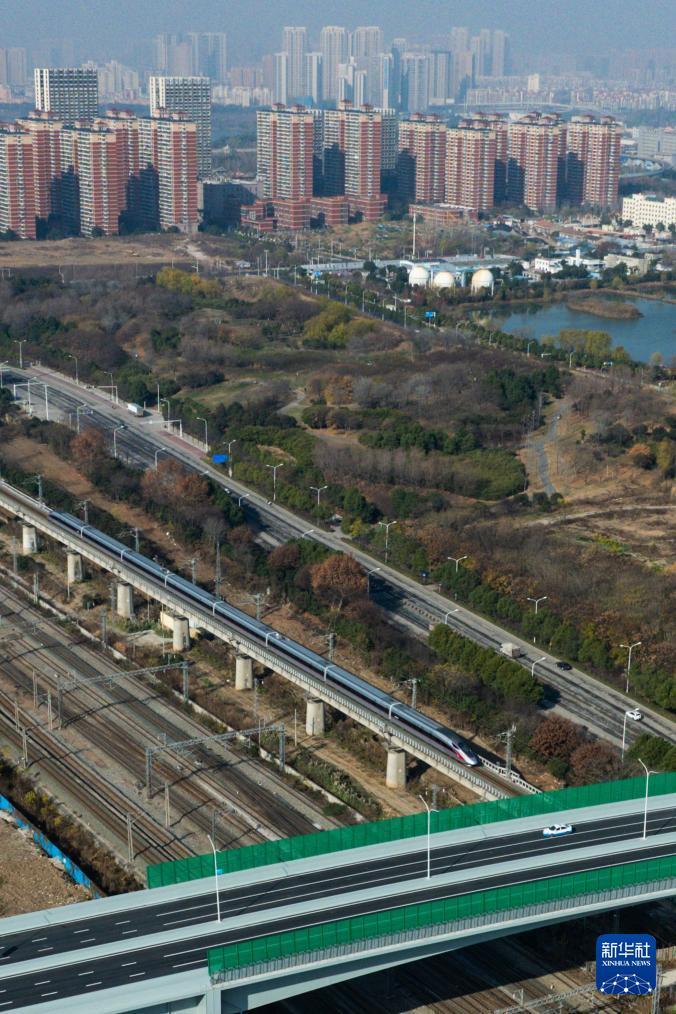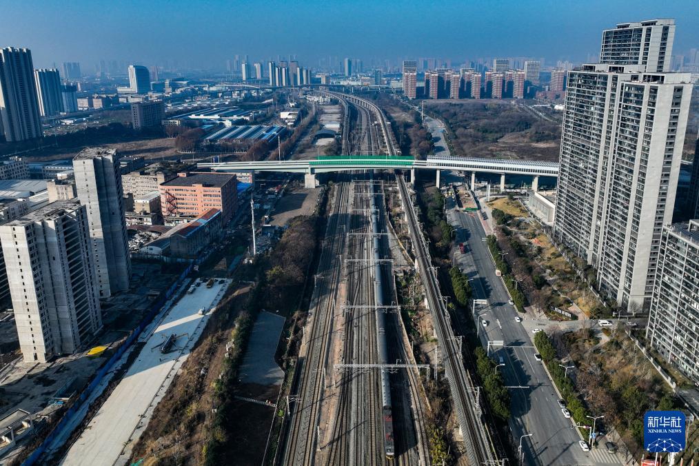12月28日,列车从武汉古田一路北段下方穿行(无人机照片)。 12月28日,由湖北交投集团投资、中铁十一局等单位参建的武汉市古田一路北段工程正式建成通车。道路全长2.78公里,横跨沪渝蓉高铁、汉丹铁路及武汉三环线。据了解,建成通车的古田一路北段将与在建的江汉十桥形成“一桥一路穿三区”的交通新骨架,串联汉阳、硚口、东西湖三大片区,惠及沿线数十万居民出行。 新华社记者 伍志尊 摄