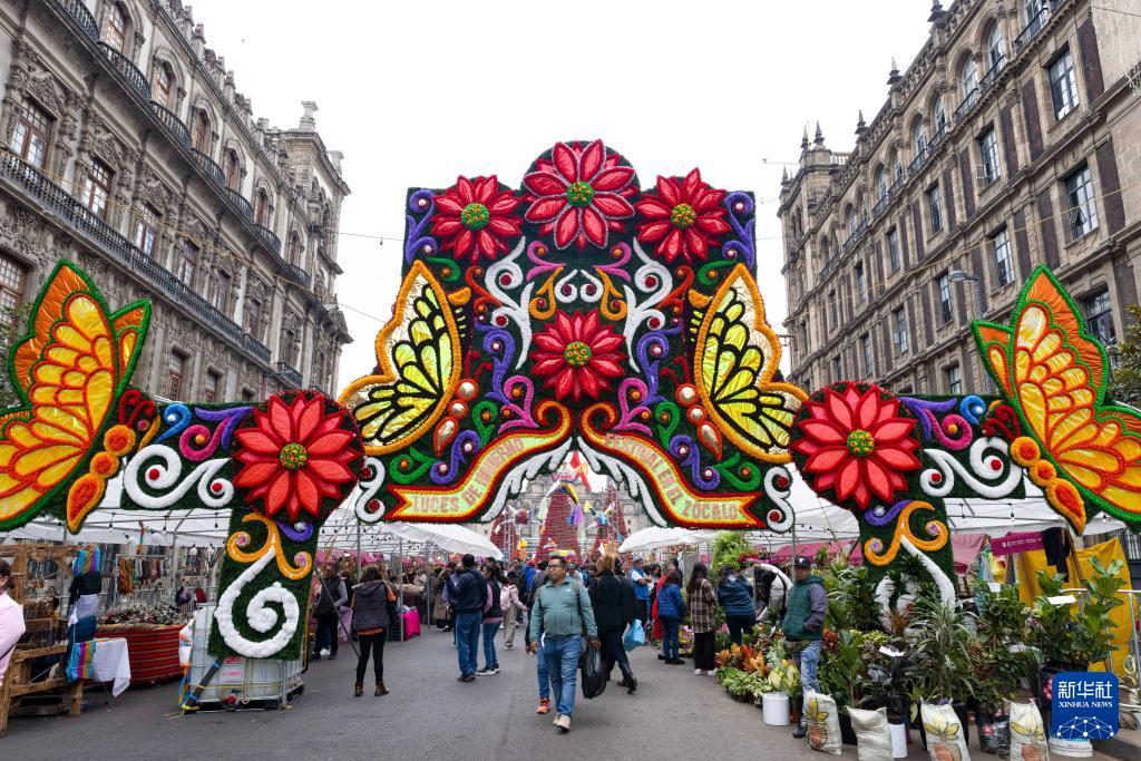 这是12月30日在墨西哥首都墨西哥城宪法广场拍摄的节日装饰。 2026年即将到来,墨西哥城多地装点节日装饰,洋溢着新年的喜庆气氛。 新华社记者 李梦馨 摄