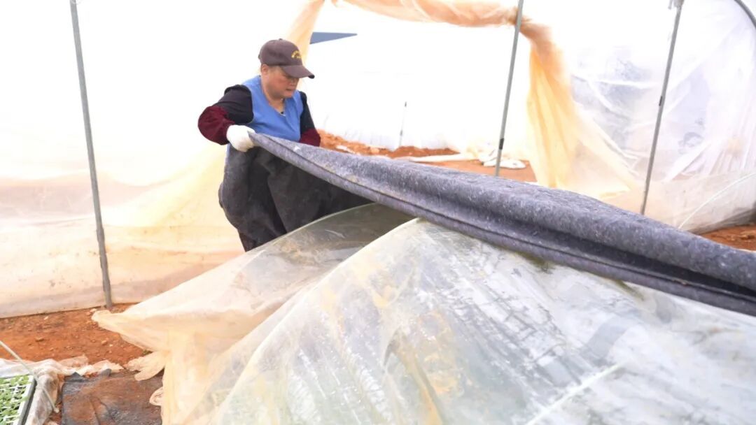 ▲给烟苗盖再生棉 浦城县隆庆农机专业合作社理事长刘军说:“大概在零度到一度的时候,我们用双层薄膜遮盖烟苗,到零下一度的时候会用再生棉遮盖以保暖。” 技术人员重点围绕大棚加固、多层覆盖等关键措施,指导烟农做好棚体检查,加装内层保温膜、再生棉等防寒设施,避免烟苗遭受冻害。南平市烟草公司浦城分公司技术主管潘强说:“低温天气下,烟苗容易出现冻害等问题。我们一方面指导烟农做好棚内保温工作,另一方面及时通风排湿,预防病害发生,确保烟苗健壮生长。”