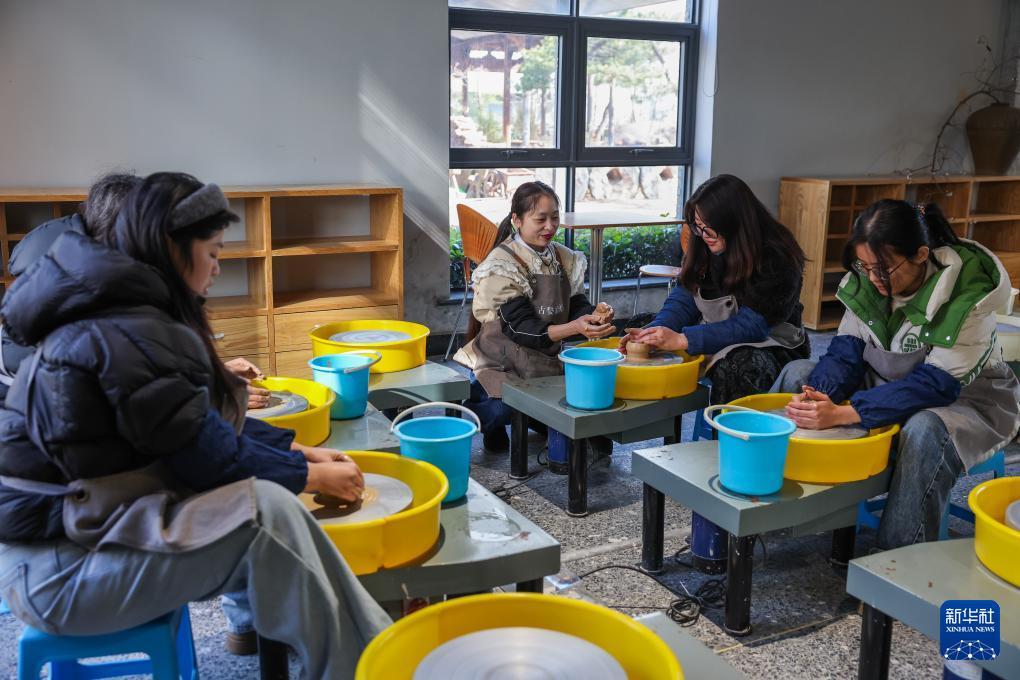 1月8日,游客在金华市金东区古婺窑火陶瓷文化艺术馆的体验区体验陶艺制作。 近年来,浙江省金华市金东区持续探索运用文化、运动、音乐等新元素融合文旅资源,打造包括体育公园、露营基地、乡村老街、陶瓷文化艺术馆等在内的特色文旅新消费场景,引入多样化的文旅新体验、新玩法,展现城市风采,推动全域旅游品质提升,不断创新文旅经济业态及消费场景,激发消费新活力。 新华社记者 徐昱 摄