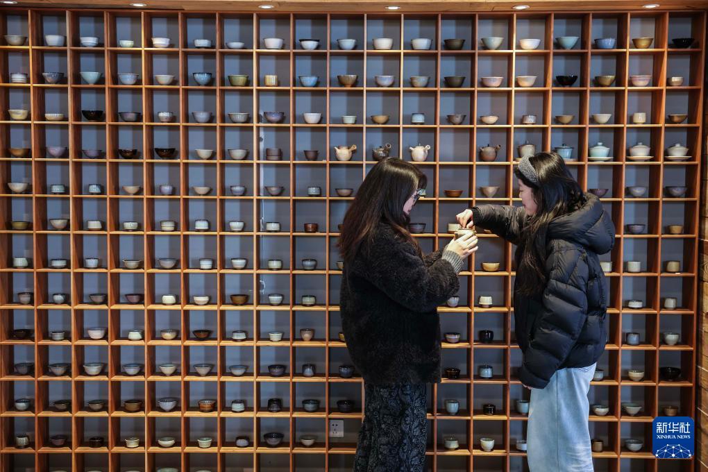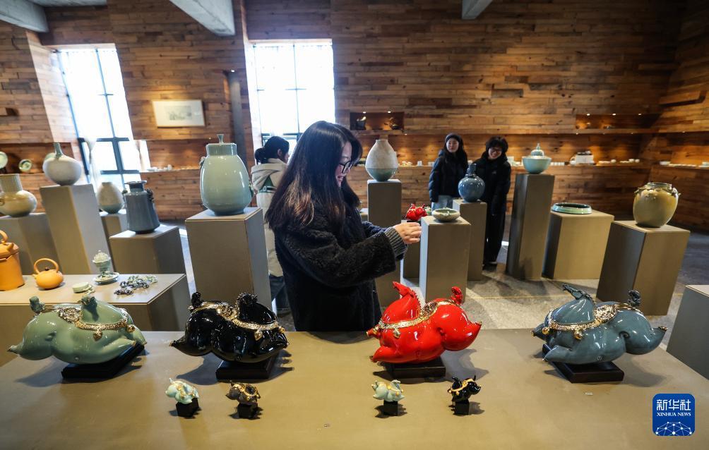 1月8日,游客在金华市金东区古婺窑火陶瓷文化艺术馆里欣赏婺州窑作品。 近年来,浙江省金华市金东区持续探索运用文化、运动、音乐等新元素融合文旅资源,打造包括体育公园、露营基地、乡村老街、陶瓷文化艺术馆等在内的特色文旅新消费场景,引入多样化的文旅新体验、新玩法,展现城市风采,推动全域旅游品质提升,不断创新文旅经济业态及消费场景,激发消费新活力。 新华社记者 徐昱 摄
