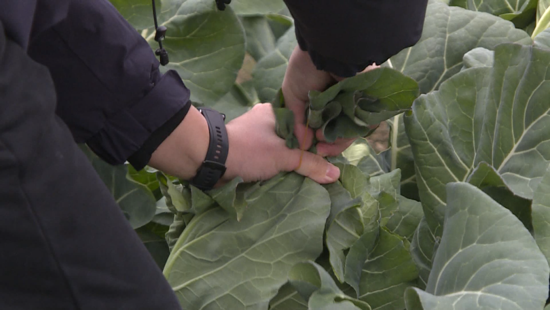 ▲种植大户马芳华为花菜穿上“防寒衣” 记者来到临江镇水西村看到,马芳华与工人正在田里忙碌着用牛筋给花菜穿上一件件“防寒衣”。据介绍,今年他利用冬闲田,种植了100亩花菜和包菜。面对突如其来的寒潮,他并没有慌张,而是采用了源自农户经验的“土办法”防寒。 马芳华说:“原来的花菜是用叶子盖,今年我们是通过订单农业学到这一招,用牛皮筋扎一下就可以。牛皮筋弹性好、耐低温,捆绑后不伤叶片,霜冻的时候更不容让花菜里面不受冻,晴天时解开也方便。” 除了束叶防寒,针对强冷空气,临江镇还指导农户采取增施热性有机肥等多种措施,全力保障冬季蔬菜生产。马芳华的100亩蔬菜目前长势良好,预计春节前后能如期上市。 马芳华介绍:“一亩地差不多可以种植2000多颗花菜,按照我的预估,平均每科两斤半左右,亩产也有5000多斤。按照现在市场的行情两块来钱一斤的话一亩地也有七八千块钱。”