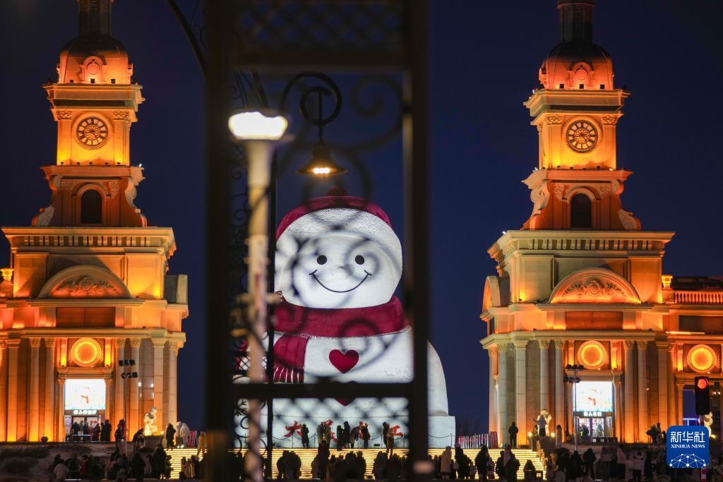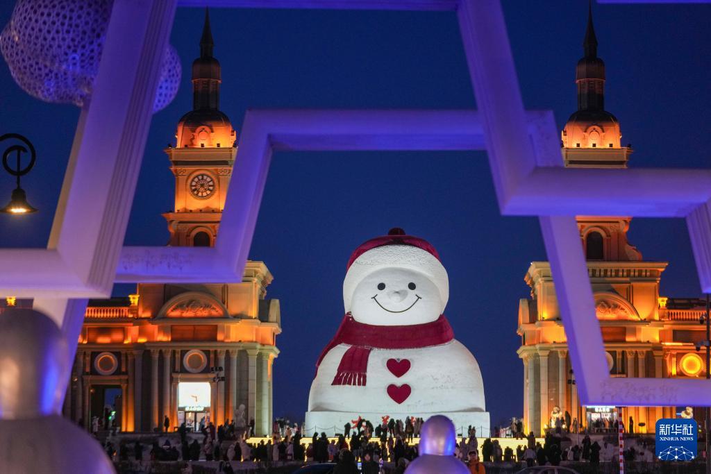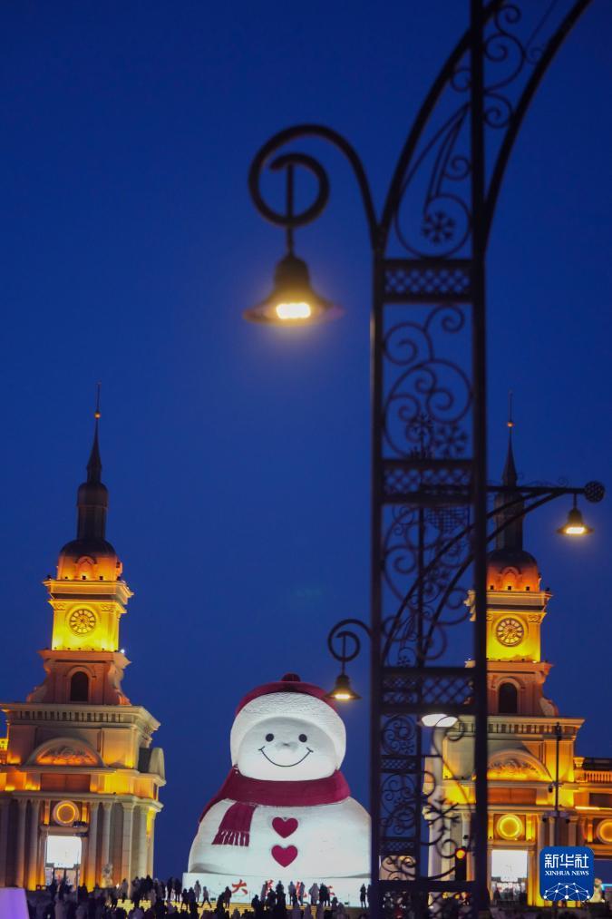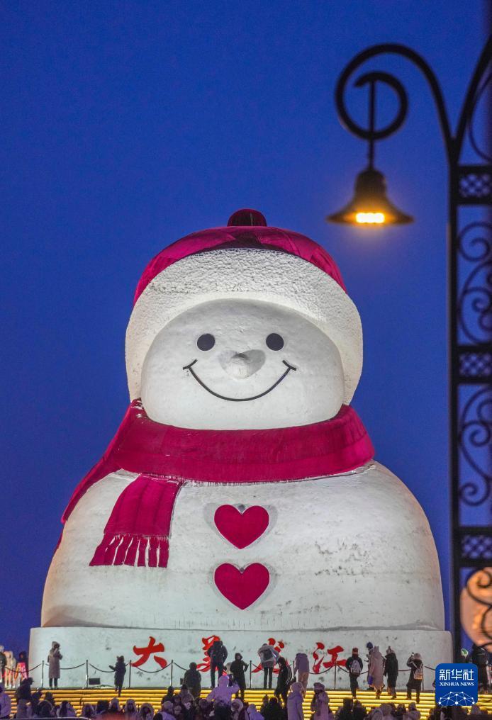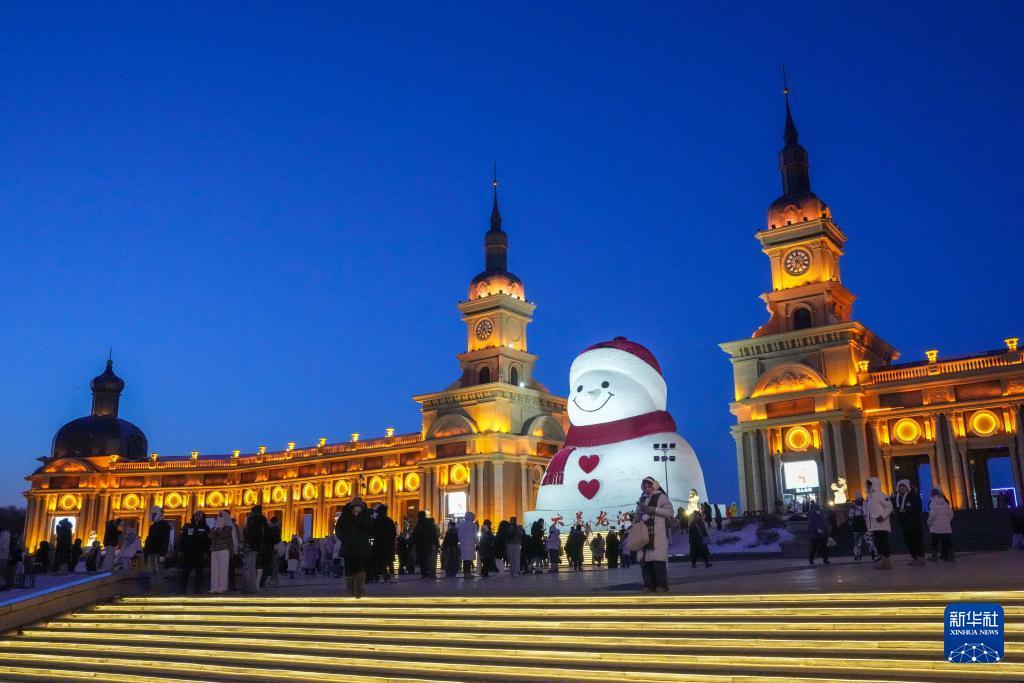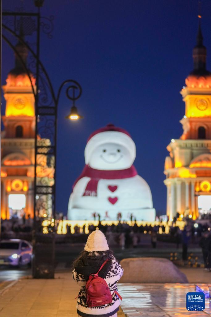 1月10日,游客在哈尔滨市群力音乐公园的大雪人前打卡拍照。 时下,“冰城”哈尔滨市正值冰雪旅游旺季。位于哈尔滨市群力音乐公园的大雪人吸引着众多游客前来打卡。日落后的蓝调时刻,在天光与灯光的交相映照下,大雪人更显浪漫迷人。 新华社记者 王建威 摄