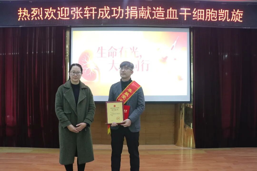 ▲为张轩颁发荣誉证书 张轩:医者仁心践使命 热血捐髓显担当 2月6日,在浦城县医院举行的先进事迹表彰会上,热烈欢迎张轩成功捐献造血干细胞凯旋。对他主动捐献造血干细胞、用爱心挽救陌生生命的行为给予高度评价,号召全院职工以张轩为榜样,将无私奉献的精神融入日常工作,践行医者初心、传递人间大爱。医院各科室职工代表参会,共同聆听张轩的捐献故事,感受平凡中的伟大。