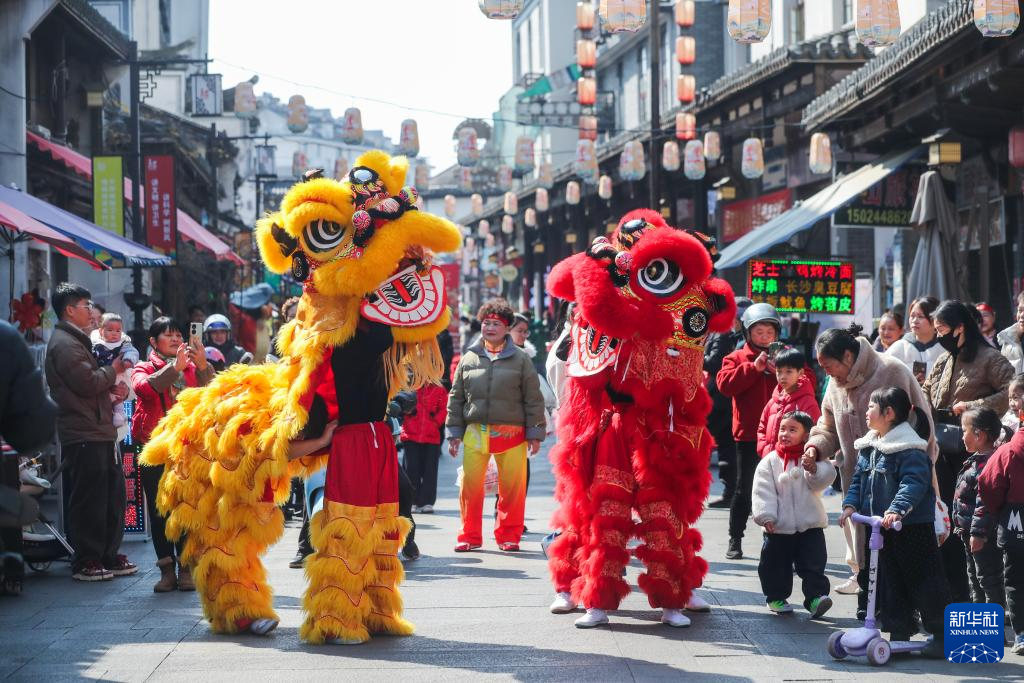 2月8日,游客在寿昌古镇老街上观看传统舞狮表演。 近期,浙江省建德市寿昌古镇举办传统民俗迎新春活动,民俗踩街、舞龙舞狮、马年主题灯展等活动,吸引八方游客前来体验古镇传统年味,进一步激活新春消费市场,为当地文旅经济发展注入新动能。 新华社记者 徐昱 摄