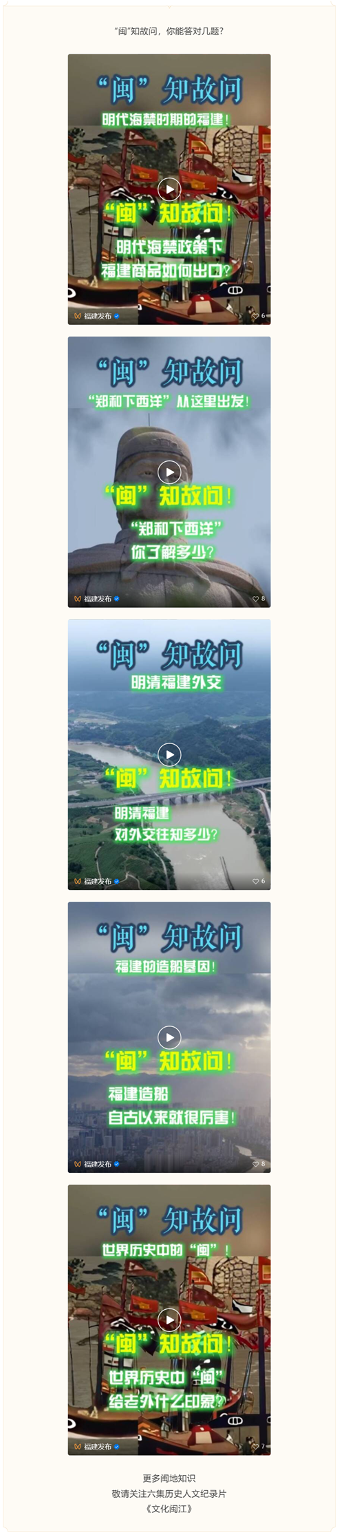 第四集《开洋万里》 第一次完整解读 闽江如何连通海洋 并在“开洋万里”的大版图所扮演角色 播出平台及时间 东南卫视 2月18日-2月23日17:50 海峡卫视 2月18日-2月23日20:25 综合频道 2月18日-2月23日21:04 Bilibili 海博TV同步推出 更多闽地知识 敬请关注六集历史人文纪录片 《文化闽江》 作为“福建文脉”工程第一季作品,纪录片由福建省委宣传部策划指导、省广播电视局支持、省广播影视集团历时近两年精心打磨,以母亲河闽江为叙事主轴,贯通自然地理、历史变迁与当代风采,全景呈现闽江流域的文化根脉、人文价值与时代气象。 点击查看《文化闽江》纪录片 完整内容↑ |