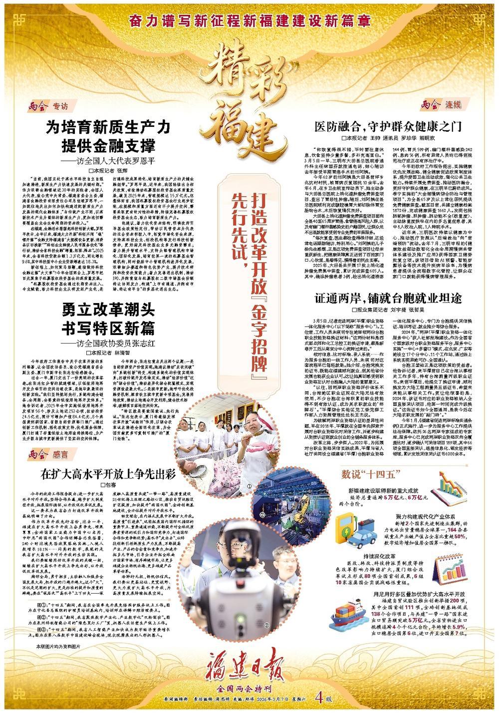 《福建日报》2026年3月7日第04版 先行先试,打造改革开放“金字招牌” 两会专访 为培育新质生产力提供金融支撑——访全国人大代表罗恩平 “当前,我国正处于高水平科技自立自强加速推进,新质生产力快速发展的关键时期。”作为深耕金融领域近30年的实践者,全国人大代表,致公党中央常委、福建省委会主委,福建省金融投资有限责任公司总经理罗恩平,一如既往地关注如何加快构建适配新质生产力发展的现代金融体系,“与传统产业不同,以高新技术产业为载体的新质生产力,更加迫切需要覆盖企业全生命周期的资本投入。”详情>>> 勇立改革潮头 书写特区新篇——访全国政协委员张志红 今年两会,张志红重点关注两个议题:一是自然资源资产价值实现。她建议推动“点状突破”向“系统创新”转变,构建系统化的价值实现体系;打破传统开发思维定式,推动“经济价值”迈向“综合价值”;推动差异化综合配置模式,实现资源效益最大化。二是城市更新。她呼吁优化投融资机制,探索设立城市更新专项基金;完善用地政策,推动土地混合开发利用;健全技术标准,破解项目落地空间约束。详情>>>