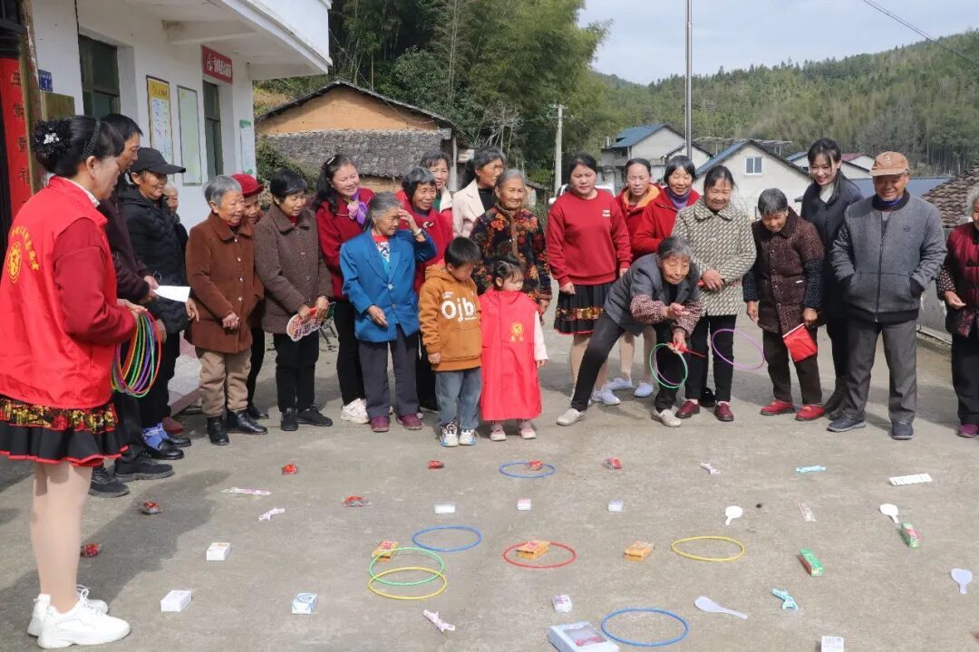 ▲趣味游戏 随后进行的“同心协力”呼啦圈接力、“好事连连”套圈圈等趣味游戏,将活动氛围推向高潮。村民们在轻松欢乐的游戏中增进邻里感情,凝聚团队力量,获胜者也在掌声中收获了奖品。