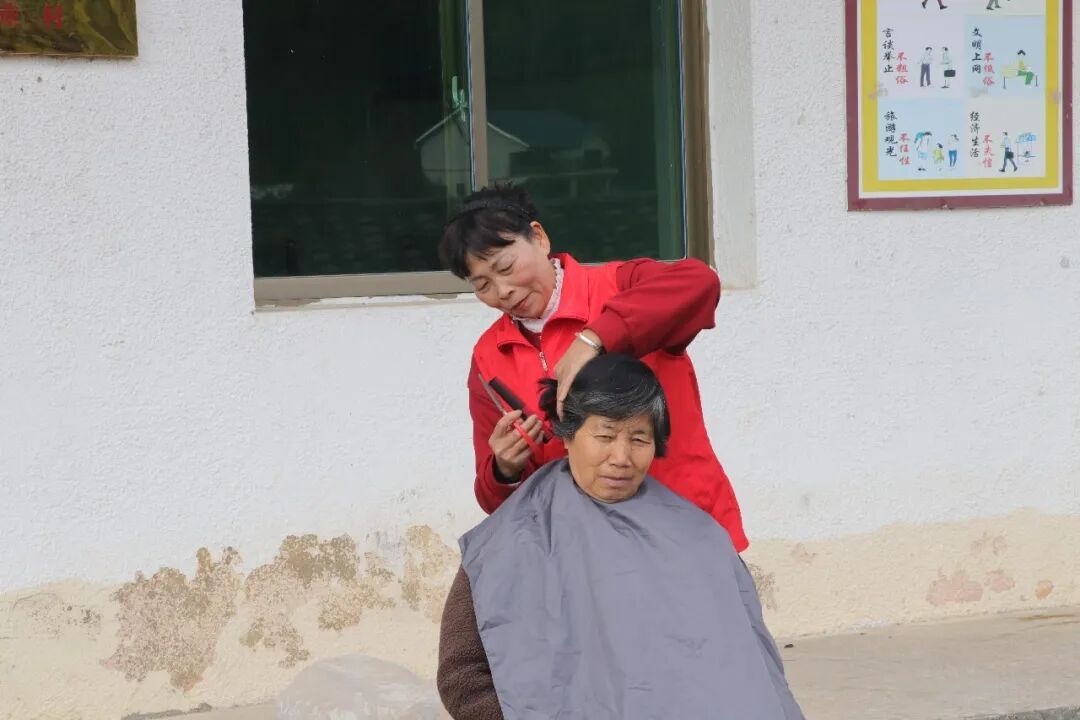 ▲暖心义剪 在另一侧,暖心义剪同步进行。志愿者为村内行动不便的老人和儿童免费理发,用一把剪刀传递温情。同一时间,另一组志愿者积极投身环境清洁行动,对村内主干道、文化广场及绿化带卫生死角进行全面清理,擦拭宣传栏与健身器材,整治乱堆乱放现象,以实际行动扮靓家园。