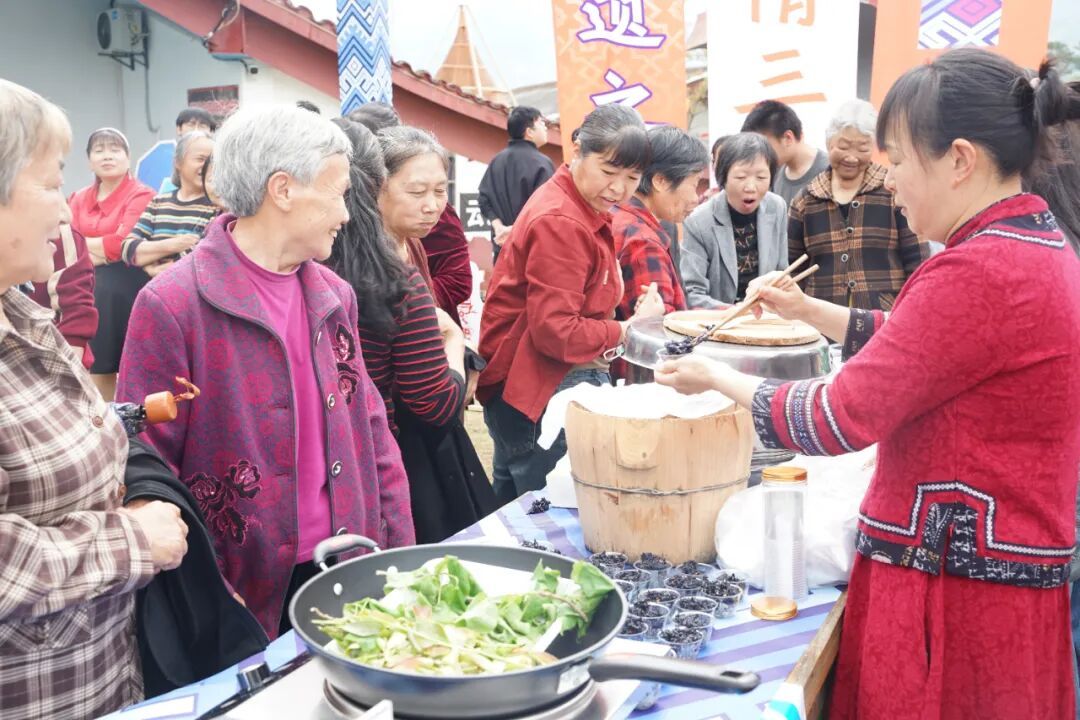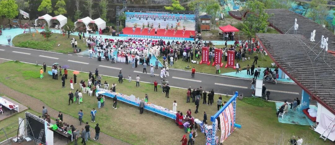 ▲活动现场 活动现场热闹非凡,主舞台上《红红火火幸福来》《竹竿舞》《开门红》《爱我中华》等节目轮番登场,穿插民族知识问答和村镇银行授信仪式;互动区内抛绣球、跳竹竿舞、非遗剪纸、漆扇体验等项目吸引众多游客参与;美食区长桌宴更是汇聚畲族乌米饭、西藏酥油茶、广西八宝茶等民族特色美食,让游客在沉浸式体验中感受“中华民族一家亲”的温暖。