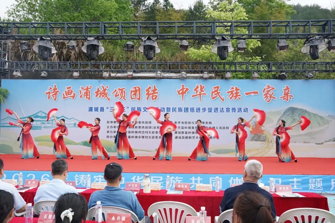 4月17日,浦城县2026年铸牢中华民族共同体意识主题月活动暨“三月三”民族文化活动在富岭镇匡湖举办,同步开展《中华人民共和国民族团结进步促进法》普法宣传。本次活动紧扣铸牢中华民族共同体意识的主线,通过普法宣传、文艺演出、非遗体验、摄影展览、美食长桌宴等丰富形式,促进各民族交往交流交融,让各族群众像石榴籽一样紧紧抱在一起。县委常委、统战部部长张轩出席并致辞。