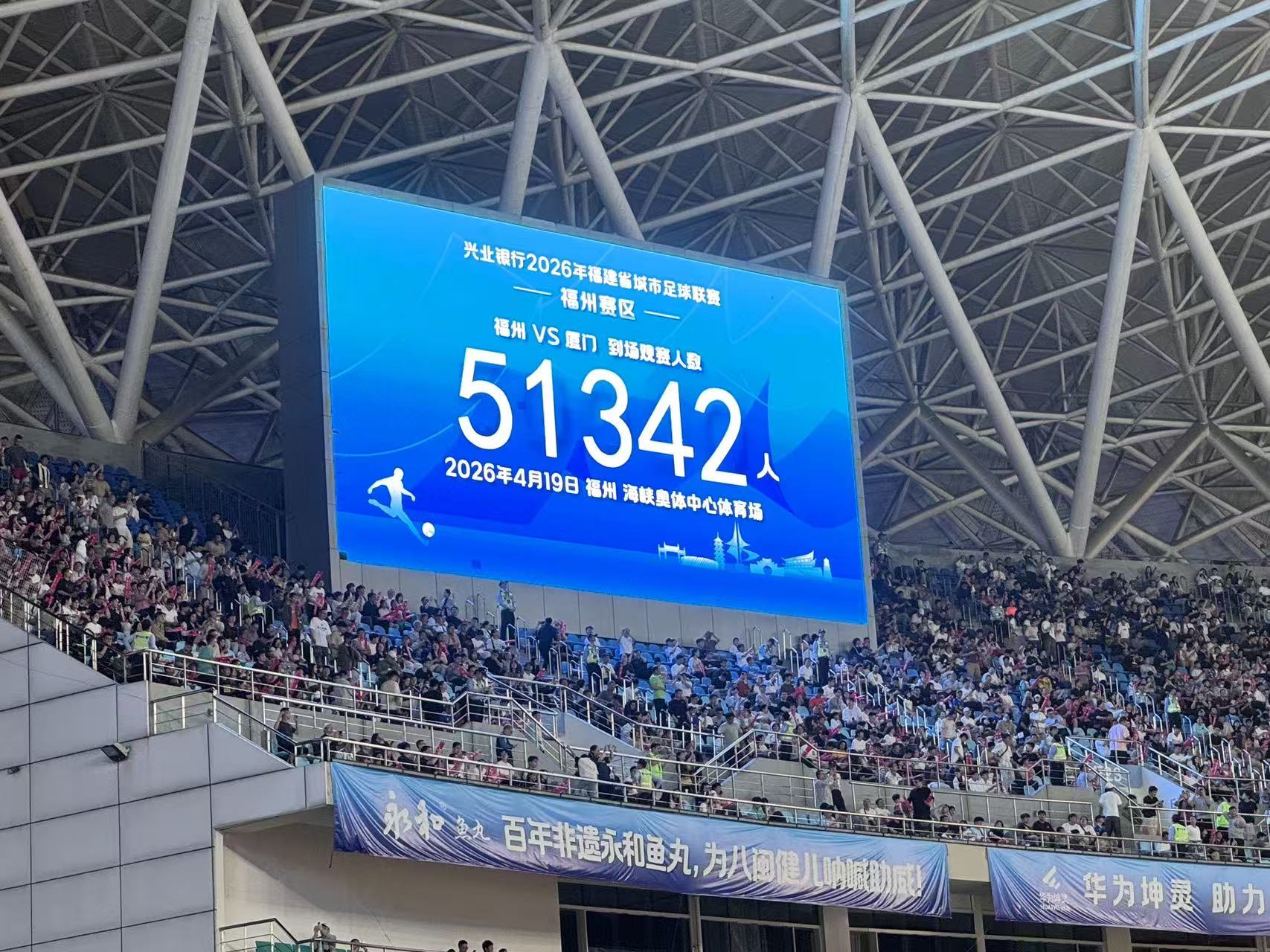 福建日报记者 林熙 摄 4月19日,福州市海峡奥林匹克体育场。连日的阴雨渐歇,“闽超”揭幕战在福州队和厦门队之间举行,51342名观众涌入现场。来自官方的统计显示,这个人数不仅创下了我省单场体育赛事现场观赛人数纪录,还创下了全国城市足球联赛揭幕战现场观赛人数纪录。