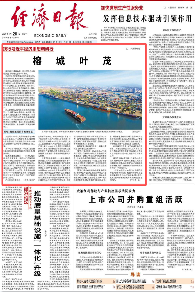 《经济日报》2026年4月20日第01版 榕城叶茂 经济日报调研组 春日福州,满城叠翠。随处可见的古榕浓荫如盖,护佑着这座两千年古城。 习近平总书记曾在福州工作生活13年,亲自领导福州改革开放和现代化建设6年。习近平总书记在福州工作期间,亲自主持编制了《福州市20年经济社会发展战略设想》,即“3820”战略工程,系统谋划了福州3年、8年、20年经济社会发展的战略目标、步骤、布局、重点和措施,明确了“建设现代化国际城市”宏伟目标,为福州擘画了美好蓝图。得益于习近平总书记当年亲自擘画建设现代化国际城市的战略指引,得益于“3820”战略工程分阶段分步骤地有序实施,福州迎来了综合实力增长最快、城乡面貌变化最大、发展成果积累最多、人民得到实惠最丰厚的时期之一。 进入新时代,福州焕发出前所未有的活力。当年播下的发展种子,在榕城大地扎根生长,已是枝繁叶茂、硕果累累。2021年3月,习近平总书记在福州考察调研时深情地说,“现在的建设都符合这个方向,跟我们当时设想是一致的,而且发展得比我们设想还要好。希望有福之州更好造福于民”。 引领:战略规划筑牢发展根基 三山两塔一条江,构成福州基本城市格局:三山是乌山、于山和屏山鼎立,雄峙城中;两塔是乌塔、白塔遥望,见证千年;一条江则是福建的“母亲河”闽江穿城而过,注入东海。 当“十四五”卷轴收拢、“十五五”蓝图铺展,福州建设现代化国际城市迈出新步伐、展现新气象。 经济总量显著提升——5年来,福州综合实力显著增强。地区生产总值每年跨越一个千亿元级台阶,2025年成功突破1.5万亿元,跃居全国万亿元城市第17位、省会城市第8位,省会首位度从22.8%提升至25%以上,人均国内生产总值(GDP)从12.1万元提升至17.76万元、居全国省会城市前列——一条稳健的上扬线,勾勒出福州经济的强大韧性和开启“十五五”新征程的信心底气。 产业结构持续优化——5年来,福州产业体系向新向优。深耕实体经济,落地19个投资超百亿元产业项目,培育形成6个千亿元产业集群、4个千亿元产业园区,规上工业战略性新兴产业产值占规上工业总产值比重达43.45%,进入全国先进制造业城市二十强,形成新型功能材料国家级战略性新兴产业集群,以及信息技术、光电、氢能源、生物医药4个省级战略性新兴产业集群。 改革开放纵深推进——5年来,福建自贸试验区福州片区推出全国首创举措35项;完成市属国企战略性重组,资产总额突破万亿元;实有经营主体超120万户,其中11家企业上榜中国民营企业500强、数量占全省超50%,36家企业入围全省民营企业100强,4家民营企业营收超千亿元、数量占全省三分之二;福州港货物吞吐量进入全球前20,集装箱港口绩效跃居全球第2位,长乐国际机场今年将实现“双航站楼+双跑道”运行;中印尼“两国双园”升级为共建“一带一路”新旗舰项目;鼓岭获授“中美青少年交流营地”;福马“同城生活圈”、台胞台企同等待遇政策体系不断完善。