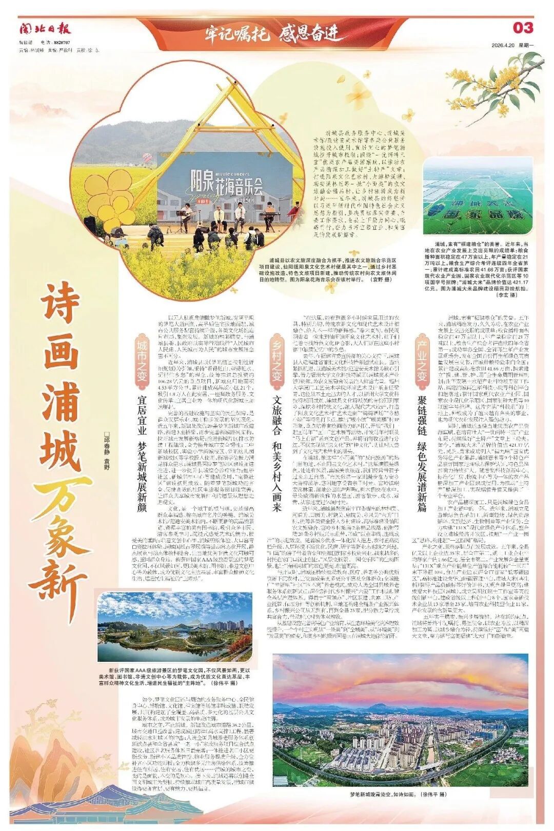 ▲4月20日,闽北日报整版报道《诗画浦城万象新》 浦城县政务服务中心、浦城美术馆/范迪安美术馆等各类公共服务设施投入使用,宜居宜业的梦笔新城拉开城市框架;围绕“一优两特三宝”优质农产品资源禀赋,以推动农产品精深加工做好“土特产”文章;打造阳泉文化艺术村、大游梓溪塘、瑞安溪林里等一批“小而美”的农文旅融合精品村,让乡村旅游成为新时尚……五年来,浦城县始终坚持以习近平新时代中国特色社会主义思想为指引,坚决贯彻落实省委、市委工作要求,全县上下勠力同心,砥砺前行,奋力书写宜居宜业、和美富足的发展新篇章。 城市之变 宜居宜业 梦笔新城展新颜 以无人机视角俯瞰梦笔新城,宽阔平坦的梦笔大道两侧,高品质住宅拔地而起,城市公共服务配套持续升级,各类文化场馆连片布局、集聚发展。新城的精彩蝶变,与浦城县委、县政府以实际行动践行“人民城市人民建、人民城市为人民”的城市发展理念密不可分。